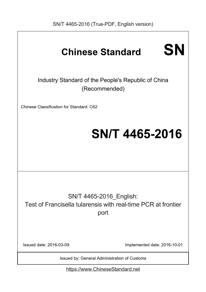Delivery: <= 3 days. True-PDF full-copy in English will be manually translated and delivered via email. SN/T 4465-2016: Test of Francisella tularensis with real-time PCR at frontier port Status: Valid
