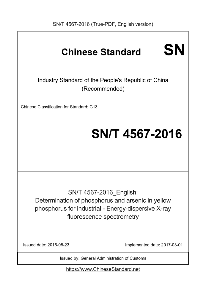 Delivery: <= 3 days. True-PDF full-copy in English will be manually translated and delivered via email. SN/T 4567-2016: Determination of phosphorus and arsenic in yellow phosphorus for industrial - Energy-dispersive X-ray fluorescence spectrometry Status: Valid