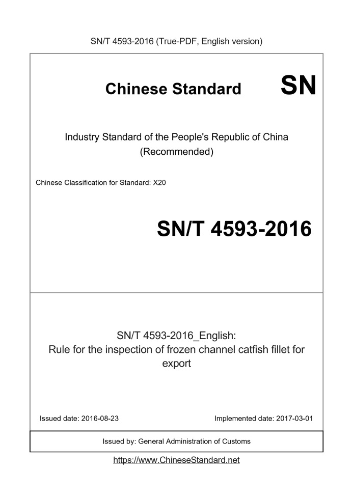Delivery: <= 3 days. True-PDF full-copy in English will be manually translated and delivered via email. SN/T 4593-2016: Rule for the inspection of frozen channel catfish fillet for export Status: Valid