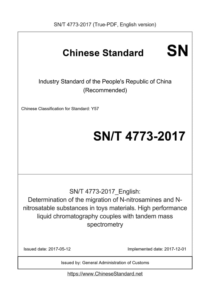 Delivery: <= 3 days. True-PDF full-copy in English will be manually translated and delivered via email. SN/T 4773-2017: Determination of the migration of N-nitrosamines and N-nitrosatable substances in toys materials. High performance liquid chromatography couples with tandem mass spectrometry Status: Valid