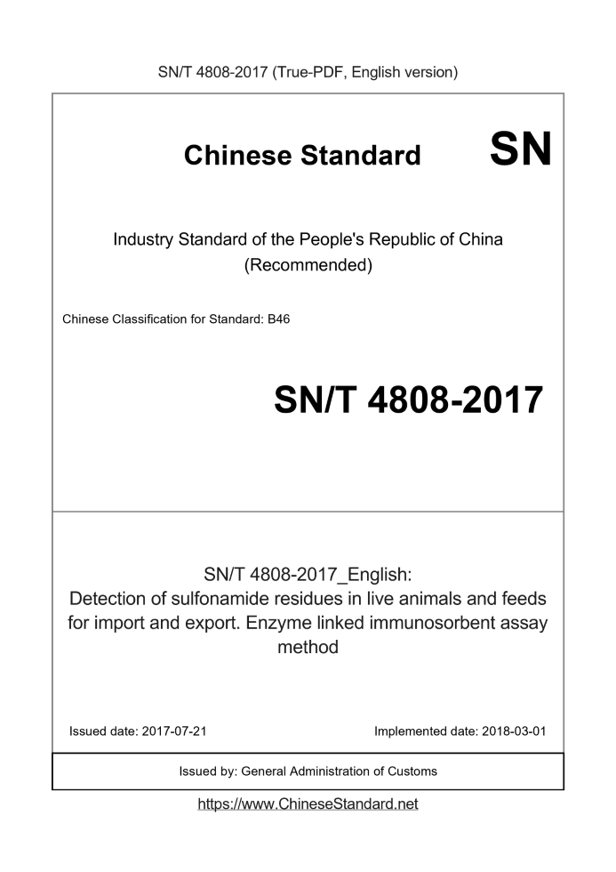 Delivery: <= 3 days. True-PDF full-copy in English will be manually translated and delivered via email. SN/T 4808-2017: Detection of sulfonamide residues in live animals and feeds for import and export. Enzyme linked immunosorbent assay method Status: Valid