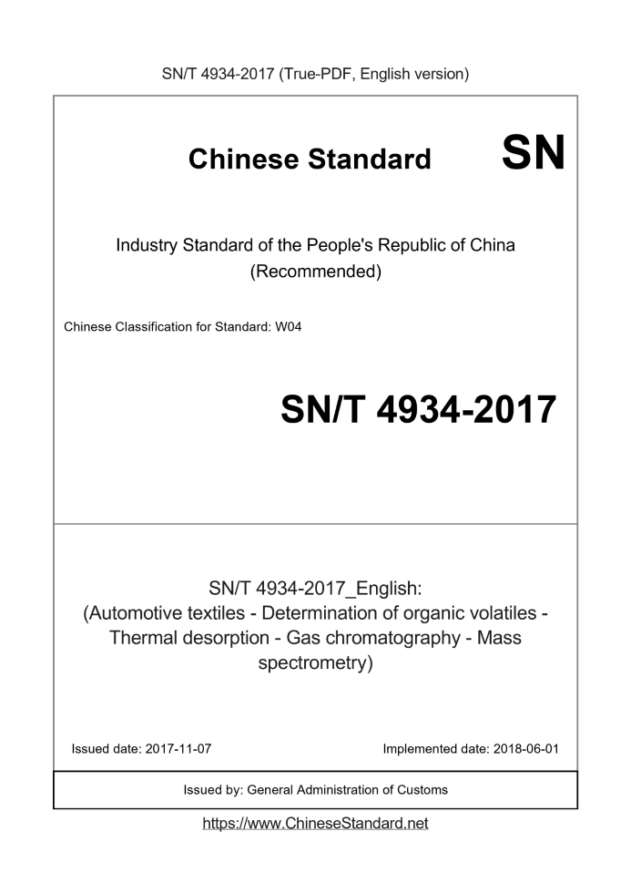 Basic dataStandard ID: SN/T 4934-2017 (SN/T4934-2017)Description (Translated English): (Automotive textiles - Determination of organic volatiles - Thermal desorption - Gas chromatography - Mass spectrometry) Sector / Industry: Commodity Inspection Standard (Recommended) Classification of Chinese Standard: W04 Date of Issue: 2017-11-07 Date of Implementation: 2018-06-01 Regulation (derived from): National Quality Inspection (2017) No.481 Issuing agency(ies): General Administration of Customs Tips & Frequently Asked Questions:Question 1: How long will the true-PDF of SN/T 4934-2017_English be delivered?Answer: Upon your order, we will start to translate SN/T 4934-2017_English as soon as possible, and keep you informed of the progress. The lead time is typically 1 ~ 3 working days. The lengthier the document the longer the lead time.Question 2: Can I share the purchased PDF of SN/T 4934-2017_English with my colleagues?Answer: Yes. The purchased PDF of SN/T 4934-2017_English will be deemed to be sold to your employer/organization who actually pays for it, including your colleagues and your employer's intranet.Question 3: Does the price include tax/VAT?Answer: Yes. Our tax invoice, downloaded/delivered in 9 seconds, includes all tax/VAT and complies with 100+ countries' tax regulations (tax exempted in 100+ countries) -- See Avoidance of Double Taxation Agreements (DTAs): List of DTAs signed between Singapore and 100+ countriesQuestion 4: Do you accept my currency other than USD?Answer: Yes. If you need your currency to be printed on the invoice, please write an email to Sales@ChineseStandard.net. In 2 working-hours, we will create a special link for you to pay in any currencies. Otherwise, follow the normal steps: Add to Cart -- Checkout -- Select your currency to pay. |