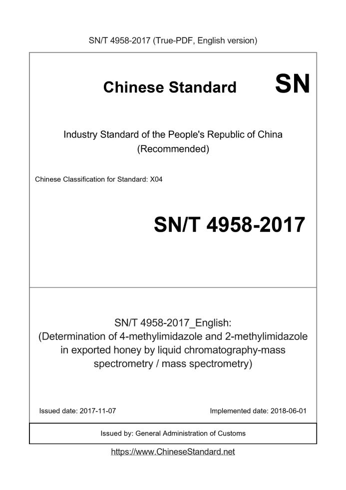 Basic dataStandard ID: SN/T 4958-2017 (SN/T4958-2017)Description (Translated English): (Determination of 4-methylimidazole and 2-methylimidazole in exported honey by liquid chromatography-mass spectrometry / mass spectrometry) Sector / Industry: Commodity Inspection Standard (Recommended) Classification of Chinese Standard: X04 Date of Issue: 2017-11-07 Date of Implementation: 2018-06-01 Regulation (derived from): National-Quality-Inspection-Accrediatation (2017) 481 Issuing agency(ies): General Administration of Customs Tips & Frequently Asked Questions:Question 1: How long will the true-PDF of SN/T 4958-2017_English be delivered?Answer: Upon your order, we will start to translate SN/T 4958-2017_English as soon as possible, and keep you informed of the progress. The lead time is typically 1 ~ 3 working days. The lengthier the document the longer the lead time.Question 2: Can I share the purchased PDF of SN/T 4958-2017_English with my colleagues?Answer: Yes. The purchased PDF of SN/T 4958-2017_English will be deemed to be sold to your employer/organization who actually pays for it, including your colleagues and your employer's intranet.Question 3: Does the price include tax/VAT?Answer: Yes. Our tax invoice, downloaded/delivered in 9 seconds, includes all tax/VAT and complies with 100+ countries' tax regulations (tax exempted in 100+ countries) -- See Avoidance of Double Taxation Agreements (DTAs): List of DTAs signed between Singapore and 100+ countriesQuestion 4: Do you accept my currency other than USD?Answer: Yes. If you need your currency to be printed on the invoice, please write an email to Sales@ChineseStandard.net. In 2 working-hours, we will create a special link for you to pay in any currencies. Otherwise, follow the normal steps: Add to Cart -- Checkout -- Select your currency to pay. |