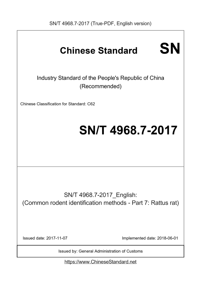 Basic dataStandard ID: SN/T 4968.7-2017 (SN/T4968.7-2017)Description (Translated English): (Common rodent identification methods - Part 7: Rattus rat) Sector / Industry: Commodity Inspection Standard (Recommended) Classification of Chinese Standard: C62 Date of Issue: 2017-11-07 Date of Implementation: 2018-06-01 Regulation (derived from): National-Quality-Inspection-Accrediatation (2017) 481 Issuing agency(ies): General Administration of Customs Tips & Frequently Asked Questions:Question 1: How long will the true-PDF of SN/T 4968.7-2017_English be delivered?Answer: Upon your order, we will start to translate SN/T 4968.7-2017_English as soon as possible, and keep you informed of the progress. The lead time is typically 1 ~ 3 working days. The lengthier the document the longer the lead time.Question 2: Can I share the purchased PDF of SN/T 4968.7-2017_English with my colleagues?Answer: Yes. The purchased PDF of SN/T 4968.7-2017_English will be deemed to be sold to your employer/organization who actually pays for it, including your colleagues and your employer's intranet.Question 3: Does the price include tax/VAT?Answer: Yes. Our tax invoice, downloaded/delivered in 9 seconds, includes all tax/VAT and complies with 100+ countries' tax regulations (tax exempted in 100+ countries) -- See Avoidance of Double Taxation Agreements (DTAs): List of DTAs signed between Singapore and 100+ countriesQuestion 4: Do you accept my currency other than USD?Answer: Yes. If you need your currency to be printed on the invoice, please write an email to Sales@ChineseStandard.net. In 2 working-hours, we will create a special link for you to pay in any currencies. Otherwise, follow the normal steps: Add to Cart -- Checkout -- Select your currency to pay. |