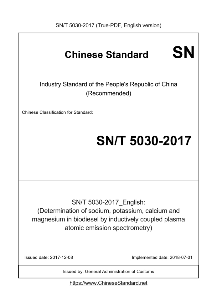 Basic dataStandard ID: SN/T 5030-2017 (SN/T5030-2017)Description (Translated English): (Determination of sodium, potassium, calcium and magnesium in biodiesel by inductively coupled plasma atomic emission spectrometry) Sector / Industry: Commodity Inspection Standard (Recommended) Date of Issue: 2017-12-08 Date of Implementation: 2018-07-01 Regulation (derived from): National-Quality-Inspection-Accrediatation (2017) 523 Issuing agency(ies): General Administration of Customs Tips & Frequently Asked Questions:Question 1: How long will the true-PDF of SN/T 5030-2017_English be delivered?Answer: Upon your order, we will start to translate SN/T 5030-2017_English as soon as possible, and keep you informed of the progress. The lead time is typically 1 ~ 3 working days. The lengthier the document the longer the lead time.Question 2: Can I share the purchased PDF of SN/T 5030-2017_English with my colleagues?Answer: Yes. The purchased PDF of SN/T 5030-2017_English will be deemed to be sold to your employer/organization who actually pays for it, including your colleagues and your employer's intranet.Question 3: Does the price include tax/VAT?Answer: Yes. Our tax invoice, downloaded/delivered in 9 seconds, includes all tax/VAT and complies with 100+ countries' tax regulations (tax exempted in 100+ countries) -- See Avoidance of Double Taxation Agreements (DTAs): List of DTAs signed between Singapore and 100+ countriesQuestion 4: Do you accept my currency other than USD?Answer: Yes. If you need your currency to be printed on the invoice, please write an email to Sales@ChineseStandard.net. In 2 working-hours, we will create a special link for you to pay in any currencies. Otherwise, follow the normal steps: Add to Cart -- Checkout -- Select your currency to pay. |
