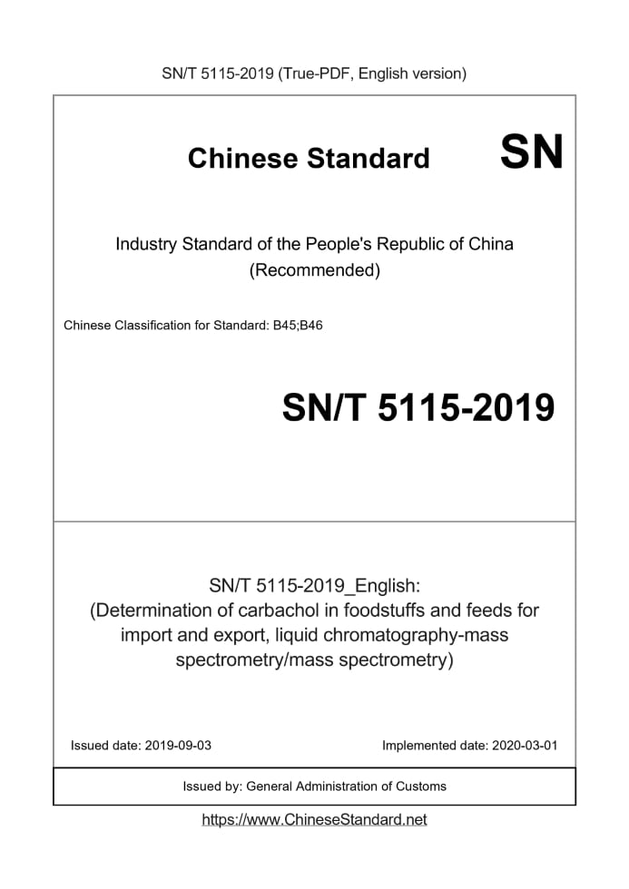 Delivery: <= 3 days. True-PDF full-copy in English will be manually translated and delivered via email. SN/T 5115-2019: (Determination of carbachol in foodstuffs and feeds for import and export, liquid chromatography-mass spectrometry/mass spectrometry) Status: Valid