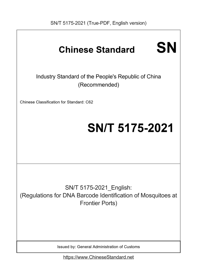 Delivery: <= 3 days. True-PDF full-copy in English will be manually translated and delivered via email. SN/T 5175-2021: (Regulations for DNA Barcode Identification of Mosquitoes at Frontier Ports) Status: Valid