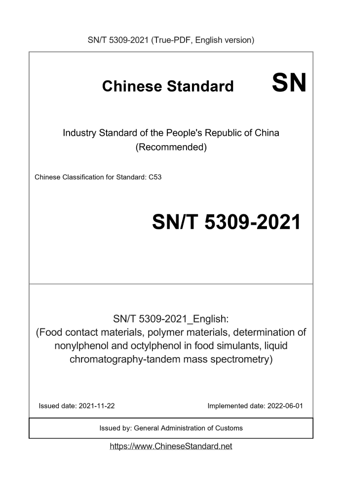 US$329.00 · In stock · Download in 9 secondsSN/T 5309-2021: (Food contact materials, polymer materials, determination of nonylphenol and octylphenol in food simulants, liquid chromatography-tandem mass spectrometry)