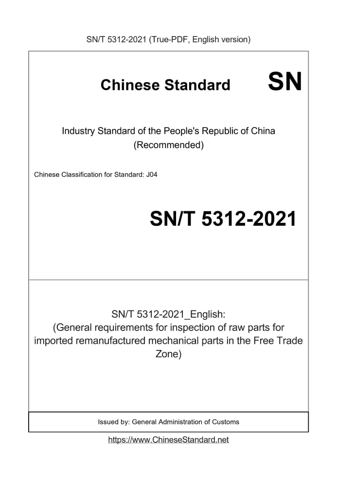 Delivery: <= 3 days. True-PDF full-copy in English will be manually translated and delivered via email. SN/T 5312-2021: (General requirements for inspection of raw parts for imported remanufactured mechanical parts in the Free Trade Zone) Status: Valid