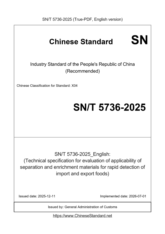 | SN/T 5736-2025 | English | RFQ | ASK | 3 days [Need to translate] | (Technical specification for evaluation of applicability of separation and enrichment materials for rapid detection of import and export foods) |