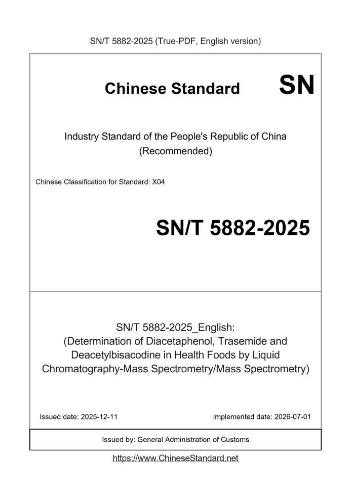 | SN/T 5882-2025 | English | RFQ | ASK | 3 days [Need to translate] | (Determination of Diacetaphenol, Trasemide and Deacetylbisacodine in Health Foods by Liquid Chromatography-Mass Spectrometry/Mass Spectrometry) |