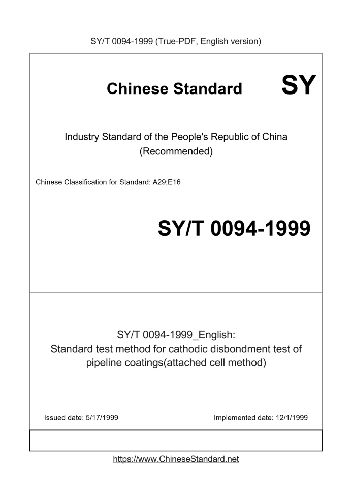 Delivery: <= 3 days. True-PDF full-copy in English will be manually translated and delivered via email. SY/T 0094-1999: Standard test method for cathodic disbondment test of pipeline coatings(attached cell method) Status: Obsolete