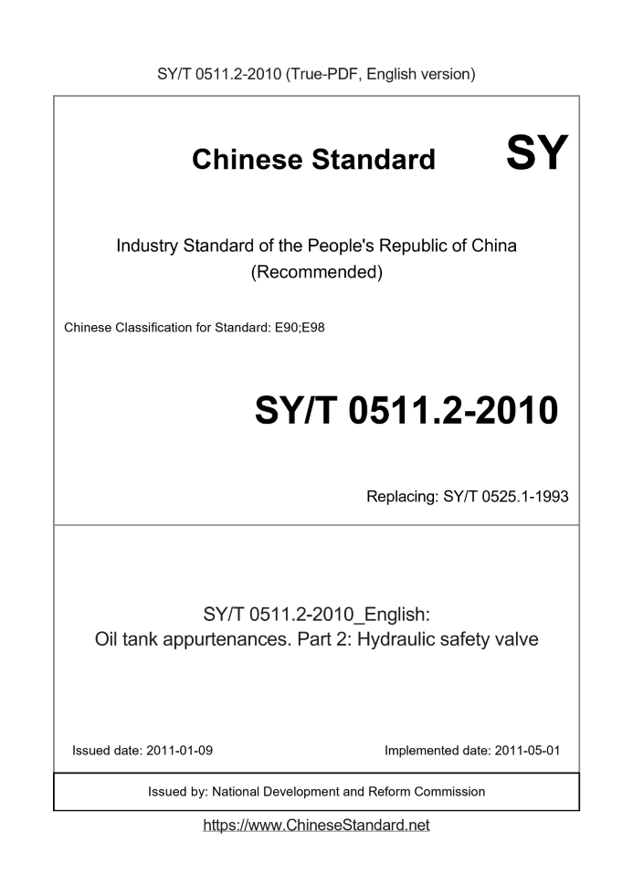 Delivery: <= 3 days. True-PDF full-copy in English will be manually translated and delivered via email. SY/T 0511.2-2010: Oil tank appurtenances. Part 2: Hydraulic safety valve Status: Valid