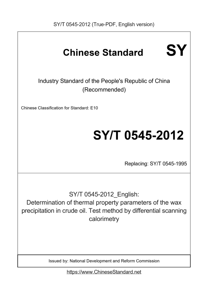 Delivery: <= 3 days. True-PDF full-copy in English will be manually translated and delivered via email. SY/T 0545-2012: Determination of thermal property parameters of the wax precipitation in crude oil. Test method by differential scanning calorimetry Status: Valid SY/T 0545: Historical versions