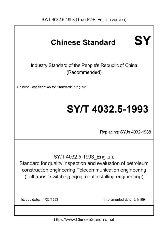 Basic dataStandard ID: SY/T 4032.5-1993 (SY/T4032.5-1993)Description (Translated English): Standard for quality inspection and evaluation of petroleum construction engineering Telecommunication engineering (Toll transit switching equipment installing engineering) Sector / Industry: Oil & Gas Industry Standard (Recommended) Classification of Chinese Standard: P71;P92 Classification of International Standard: 75-010 Word Count Estimation: 53,515 Date of Issue: 11/26/1993 Date of Implementation: 5/1/1994 Older Standard (superseded by this standard): SYJn 4032-1988 Regulation (derived from): State Energy Bureau Notice 2010 No. 2 Tips & Frequently Asked Questions:Question 1: How long will the true-PDF of SY/T 4032.5-1993_English be delivered?Answer: Upon your order, we will start to translate SY/T 4032.5-1993_English as soon as possible, and keep you informed of the progress. The lead time is typically 7 ~ 11 working days. The lengthier the document the longer the lead time.Question 2: Can I share the purchased PDF of SY/T 4032.5-1993_English with my colleagues?Answer: Yes. The purchased PDF of SY/T 4032.5-1993_English will be deemed to be sold to your employer/organization who actually pays for it, including your colleagues and your employer's intranet.Question 3: Does the price include tax/VAT?Answer: Yes. Our tax invoice, downloaded/delivered in 9 seconds, includes all tax/VAT and complies with 100+ countries' tax regulations (tax exempted in 100+ countries) -- See Avoidance of Double Taxation Agreements (DTAs): List of DTAs signed between Singapore and 100+ countriesQuestion 4: Do you accept my currency other than USD?Answer: Yes. If you need your currency to be printed on the invoice, please write an email to Sales@ChineseStandard.net. In 2 working-hours, we will create a special link for you to pay in any currencies. Otherwise, follow the normal steps: Add to Cart -- Checkout -- Select your currency to pay. |