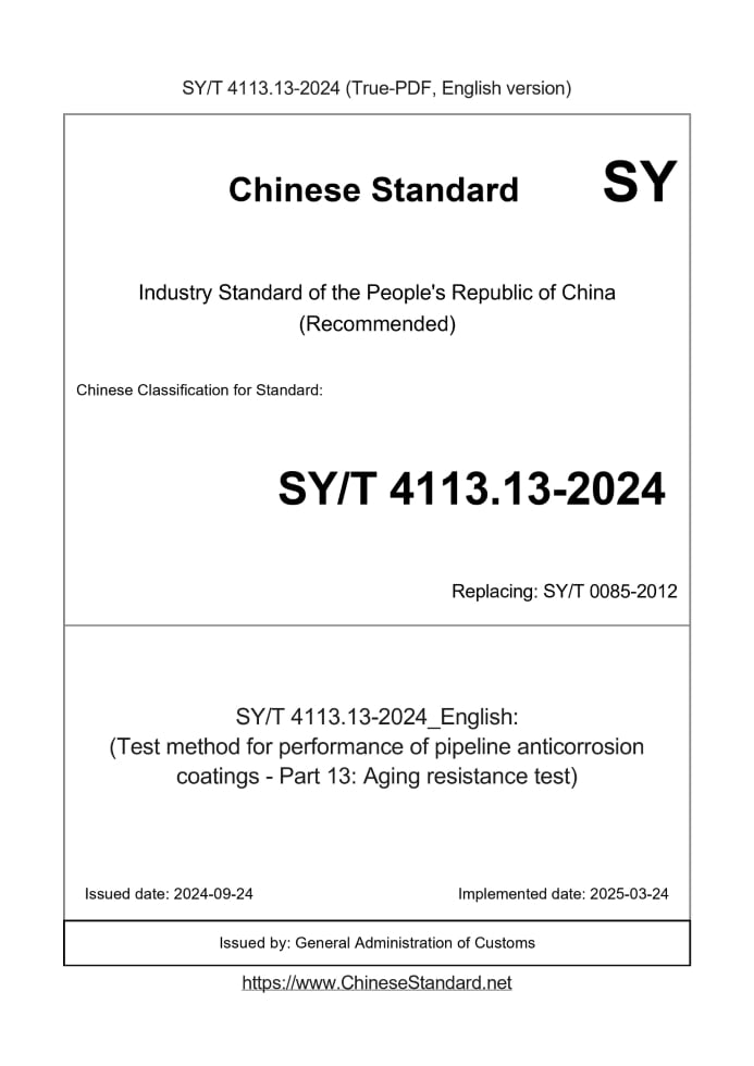 Delivery: <= 4 days. True-PDF full-copy in English will be manually translated and delivered via email. SY/T 4113.13-2024: (Test method for performance of pipeline anticorrosion coatings - Part 13: Aging resistance test) Status: Valid