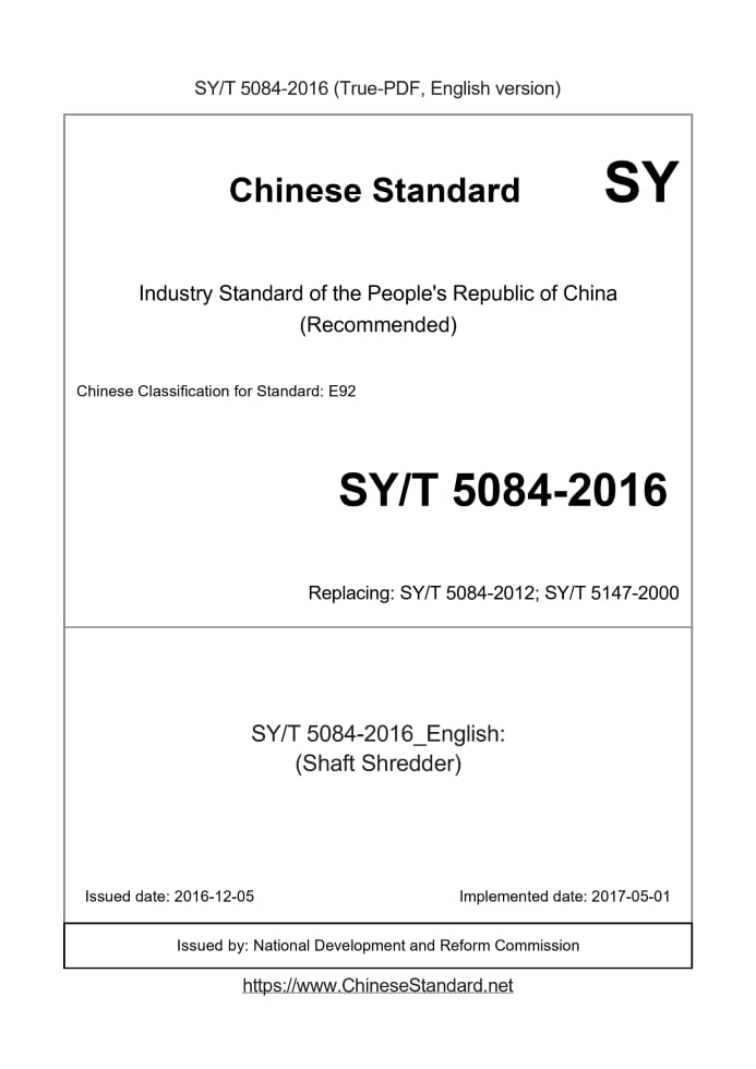 Delivery: <= 4 days. True-PDF full-copy in English will be manually translated and delivered via email. SY/T 5084-2016: (Shaft Shredder) Status: Valid SY/T 5084: Historical versions