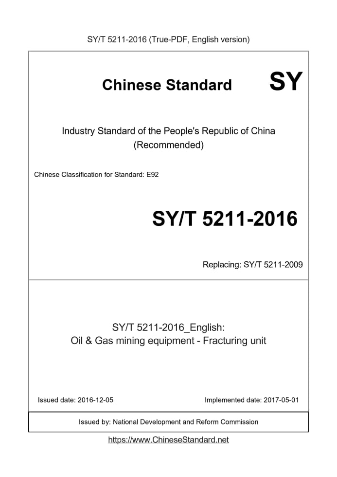 Delivery: <= 3 days. True-PDF full-copy in English will be manually translated and delivered via email. SY/T 5211-2016: Oil & Gas mining equipment - Fracturing unit Status: Valid SY/T 5211: Historical versions