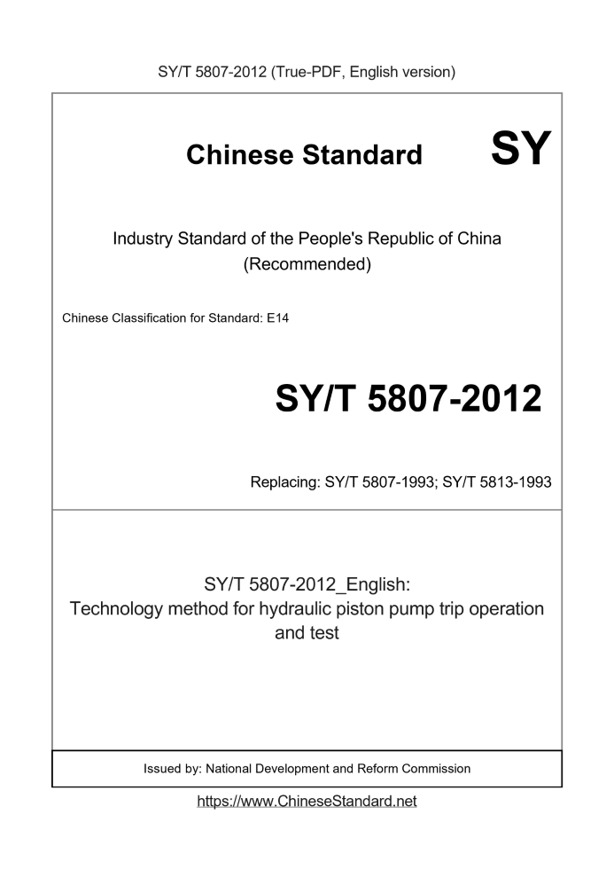 Delivery: <= 3 days. True-PDF full-copy in English will be manually translated and delivered via email. SY/T 5807-2012: Technology method for hydraulic piston pump trip operation and test Status: Valid SY/T 5807: Historical versions