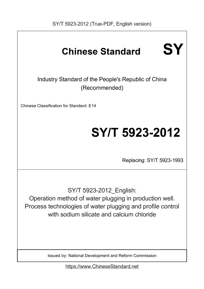 Delivery: <= 3 days. True-PDF full-copy in English will be manually translated and delivered via email. SY/T 5923-2012: Operation method of water plugging in production well. Process technologies of water plugging and profile control with sodium silicate and calcium chloride Status: Valid SY/T 5923: Historical versions