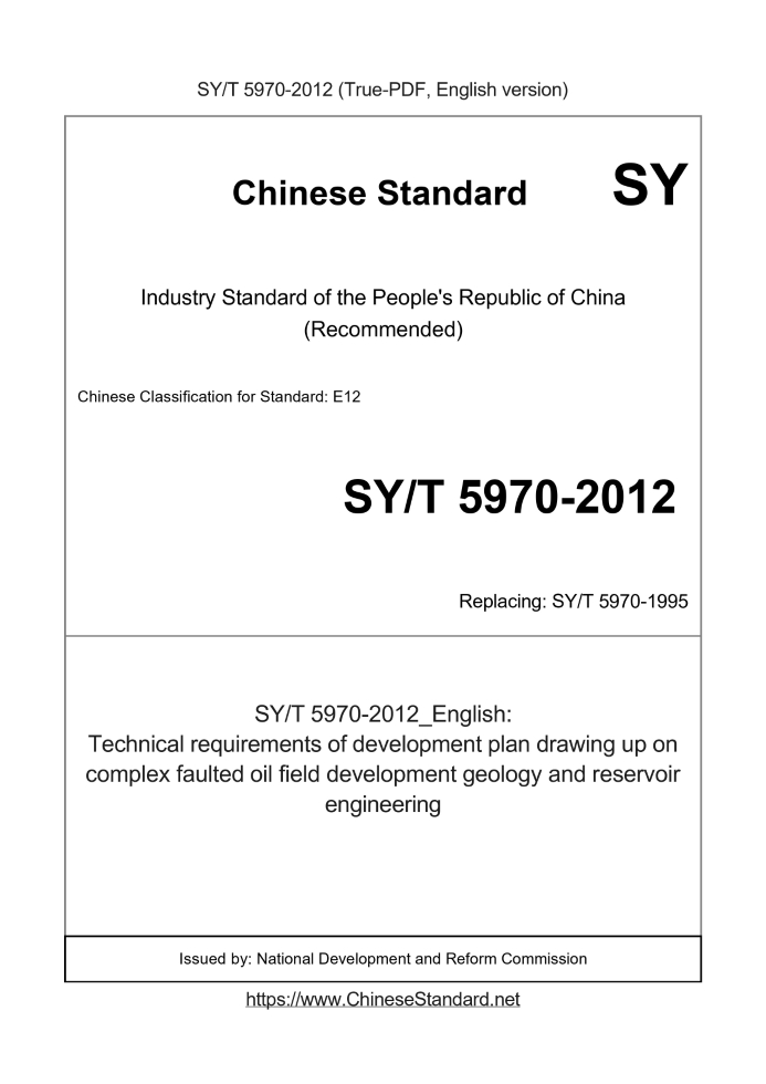 Delivery: <= 3 days. True-PDF full-copy in English will be manually translated and delivered via email. SY/T 5970-2012: Technical requirements of development plan drawing up on complex faulted oil field development geology and reservoir engineering Status: Valid SY/T 5970: Historical versions