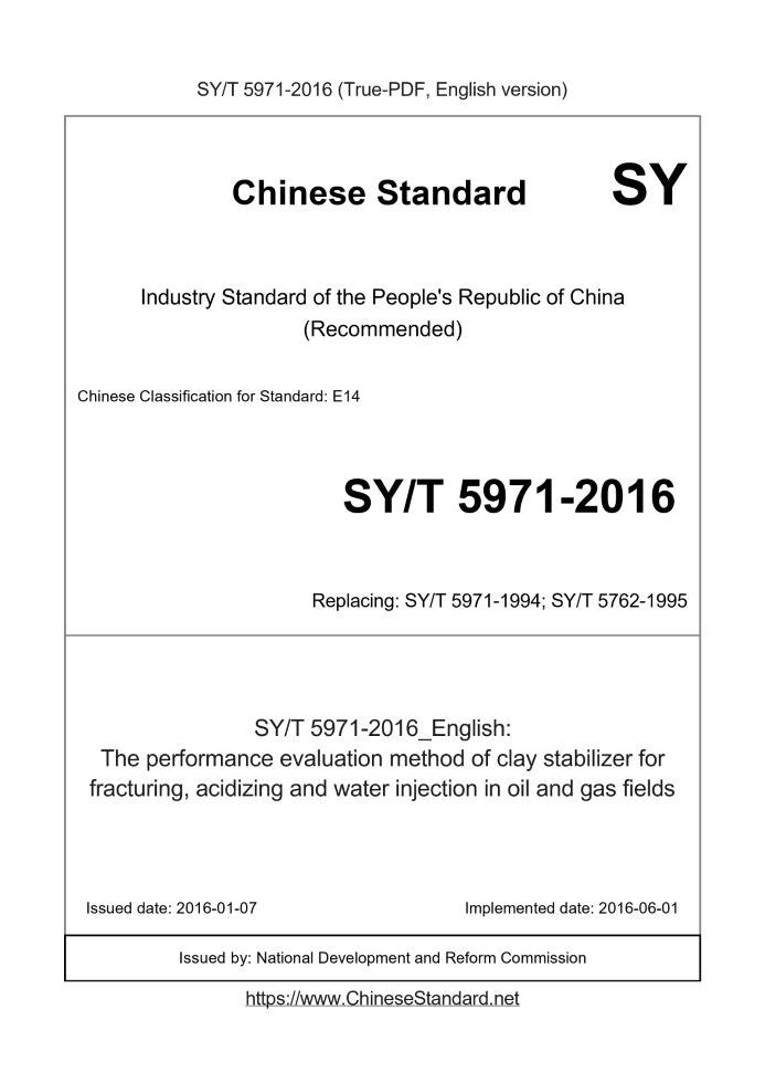 Delivery: <= 3 days. True-PDF full-copy in English will be manually translated and delivered via email. SY/T 5971-2016: The performance evaluation method of clay stabilizer for fracturing, acidizing and water injection in oil and gas fields Status: Valid SY/T 5971: Historical versions