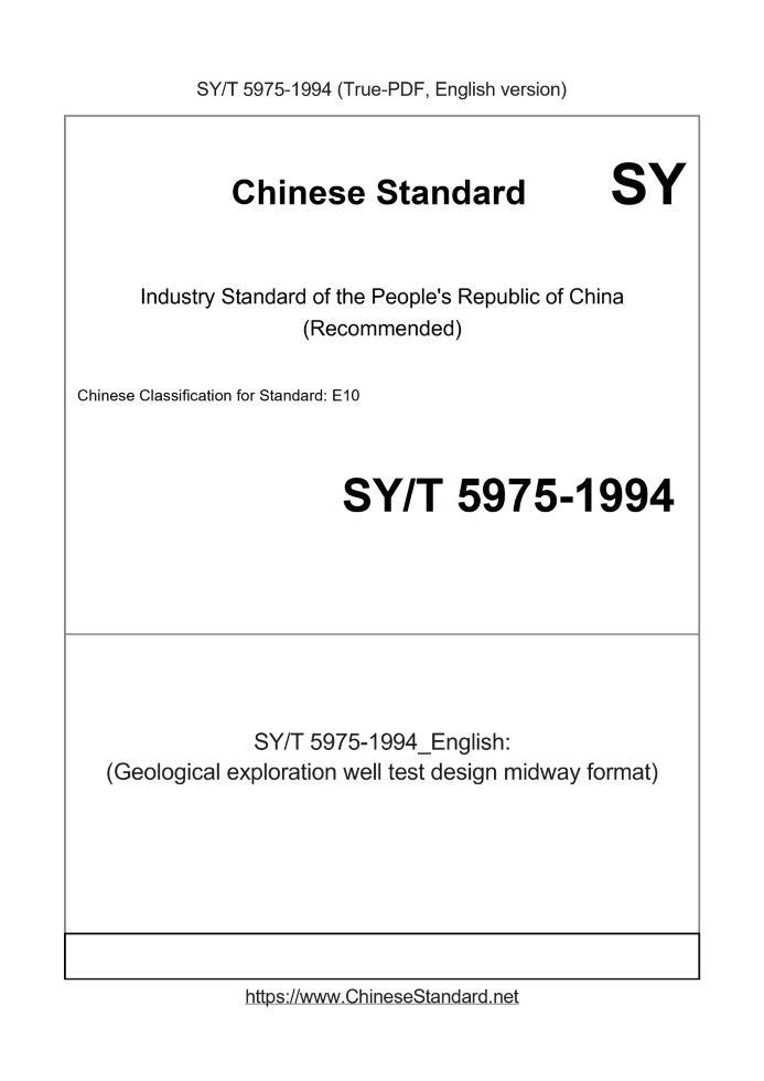 Delivery: <= 2 days. True-PDF full-copy in English will be manually translated and delivered via email. SY/T 5975-1994: (Geological exploration well test design midway format) Status: Obsolete