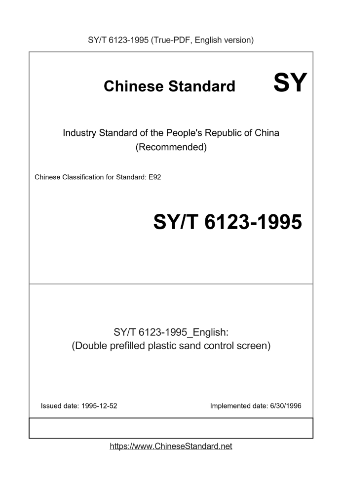 Delivery: <= 3 days. True-PDF full-copy in English will be manually translated and delivered via email. SY/T 6123-1995: (Double prefilled plastic sand control screen) Status: Obsolete
