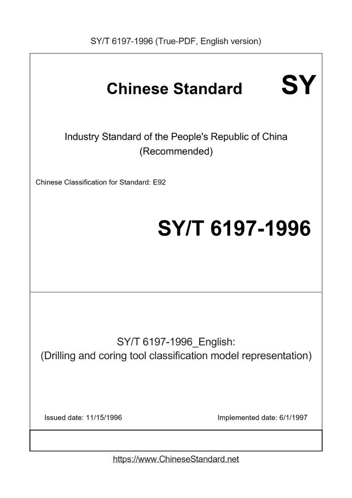 Delivery: <= 2 days. True-PDF full-copy in English will be manually translated and delivered via email. SY/T 6197-1996: (Drilling and coring tool classification model representation) Status: Obsolete