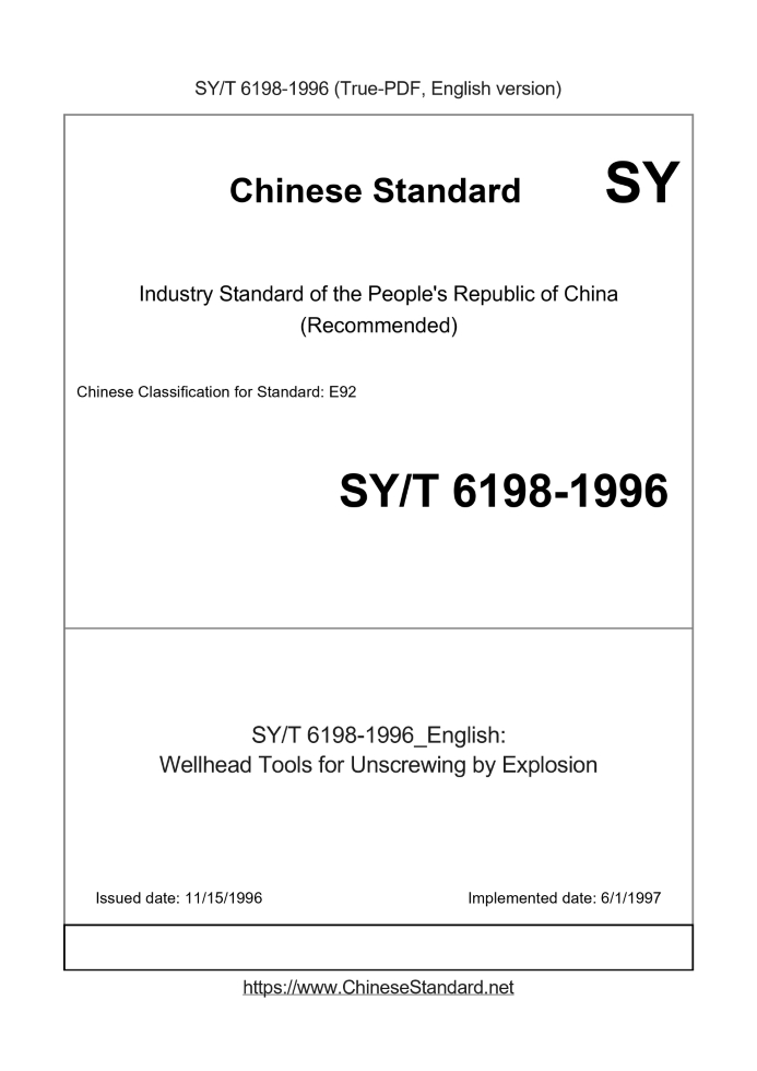 Delivery: <= 2 days. True-PDF full-copy in English will be manually translated and delivered via email. SY/T 6198-1996: Wellhead Tools for Unscrewing by Explosion Status: Obsolete