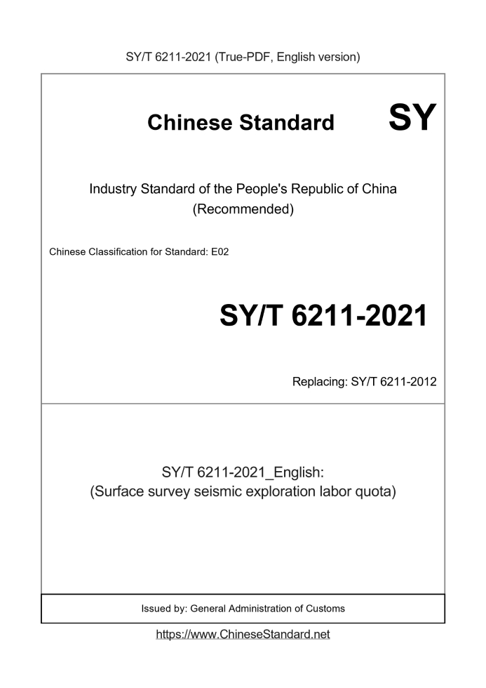 Delivery: <= 3 days. True-PDF full-copy in English will be manually translated and delivered via email. SY/T 6211-2021: (Surface survey seismic exploration labor quota) Status: Valid SY/T 6211: Historical versions