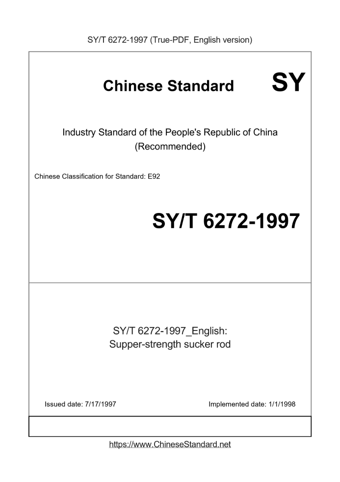 Delivery: <= 3 days. True-PDF full-copy in English will be manually translated and delivered via email. SY/T 6272-1997: Supper-strength sucker rod Status: Obsolete