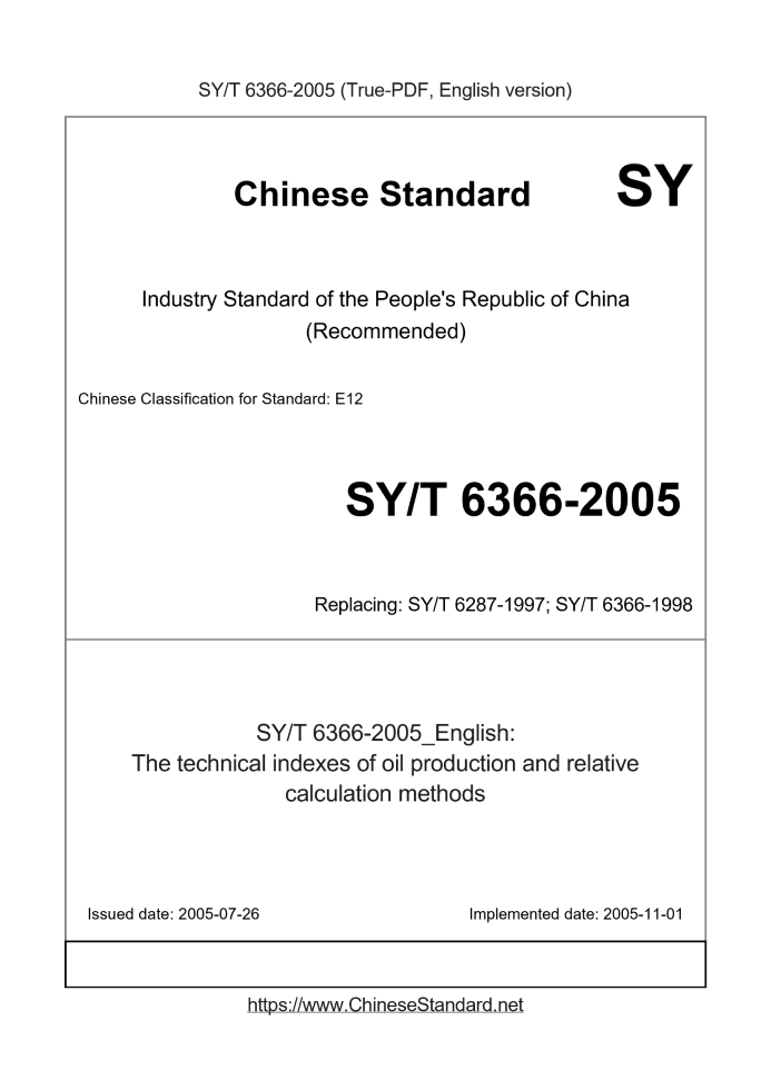 Delivery: <= 3 days. True-PDF full-copy in English will be manually translated and delivered via email. SY/T 6366-2005: The technical indexes of oil production and relative calculation methods Status: Valid SY/T 6366: Historical versions