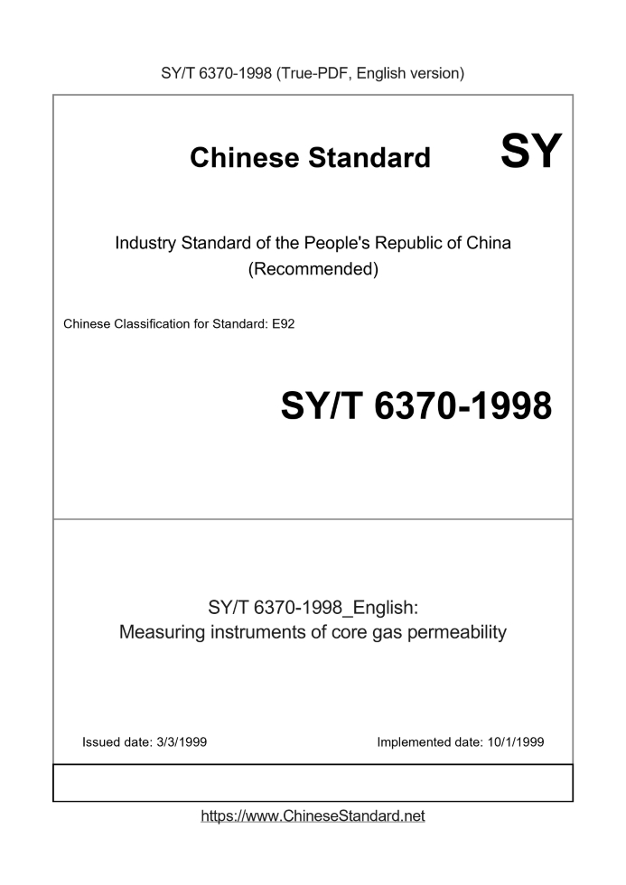 Delivery: <= 3 days. True-PDF full-copy in English will be manually translated and delivered via email. SY/T 6370-1998: Measuring instruments of core gas permeability Status: Obsolete