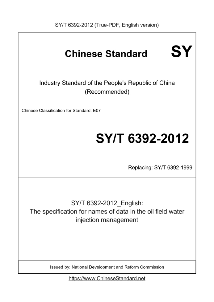 Delivery: <= 3 days. True-PDF full-copy in English will be manually translated and delivered via email. SY/T 6392-2012: The specification for names of data in the oil field water injection management Status: Valid SY/T 6392: Historical versions