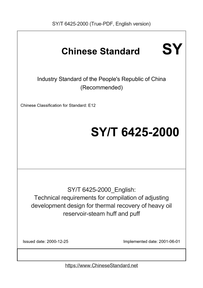 Delivery: <= 3 days. True-PDF full-copy in English will be manually translated and delivered via email. SY/T 6425-2000: Technical requirements for compilation of adjusting development design for thermal recovery of heavy oil reservoir-steam huff and puff Status: Obsolete