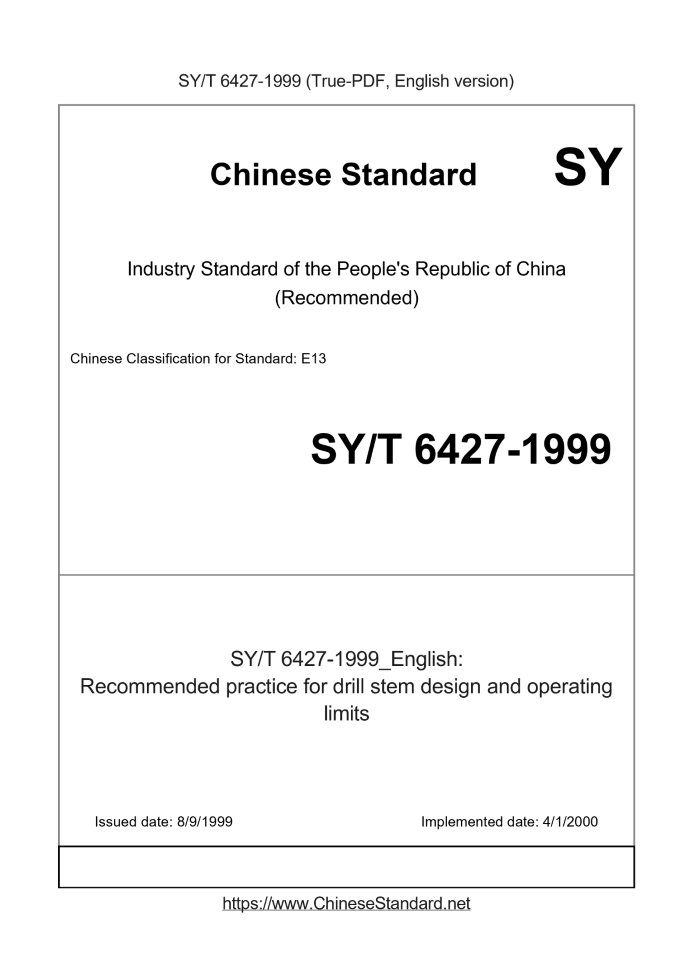 Delivery: <= 3 days. True-PDF full-copy in English will be manually translated and delivered via email. SY/T 6427-1999: Recommended practice for drill stem design and operating limits Status: Obsolete