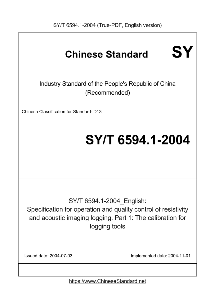 Delivery: <= 3 days. True-PDF full-copy in English will be manually translated and delivered via email. SY/T 6594.1-2004: Specification for operation and quality control of resistivity and acoustic imaging logging. Part 1: The calibration for logging tools Status: Obsolete