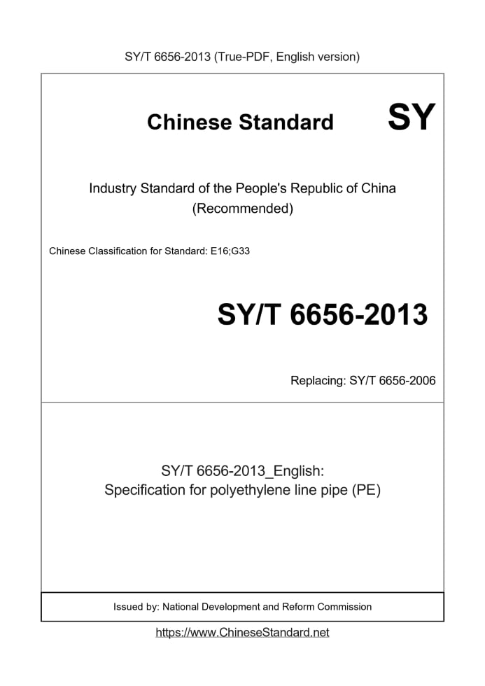 Delivery: <= 6 days. True-PDF full-copy in English will be manually translated and delivered via email. SY/T 6656-2013: Specification for polyethylene line pipe (PE) Status: Valid SY/T 6656: Historical versions