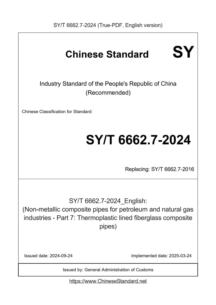 Delivery: <= 5 days. True-PDF full-copy in English will be manually translated and delivered via email. SY/T 6662.7-2024: (Non-metallic composite pipes for petroleum and natural gas industries - Part 7: Thermoplastic lined fiberglass composite pipes) Status: Valid SY/T 6662.7: Historical versions
