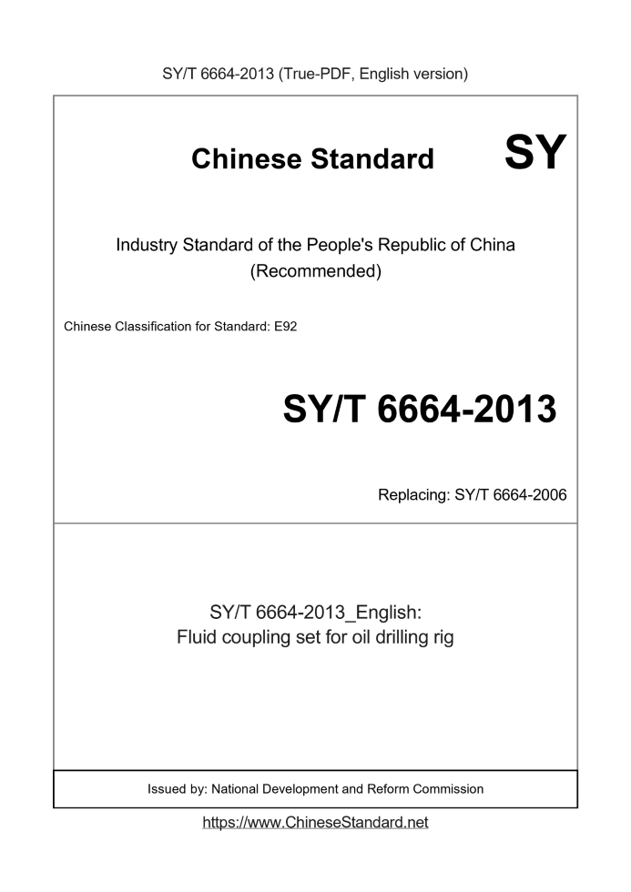 Delivery: <= 7 days. True-PDF full-copy in English will be manually translated and delivered via email. SY/T 6664-2013: Fluid coupling set for oil drilling rig Status: Valid SY/T 6664: Historical versions