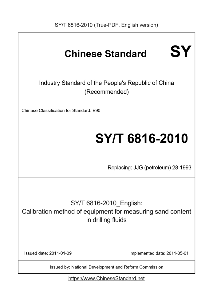 Delivery: <= 3 days. True-PDF full-copy in English will be manually translated and delivered via email. SY/T 6816-2010: Calibration method of equipment for measuring sand content in drilling fluids Status: Valid