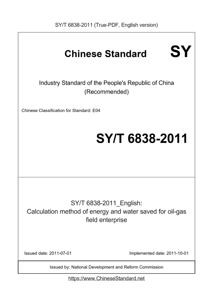 Delivery: <= 3 days. True-PDF full-copy in English will be manually translated and delivered via email. SY/T 6838-2011: Calculation method of energy and water saved for oil-gas field enterprise Status: Valid