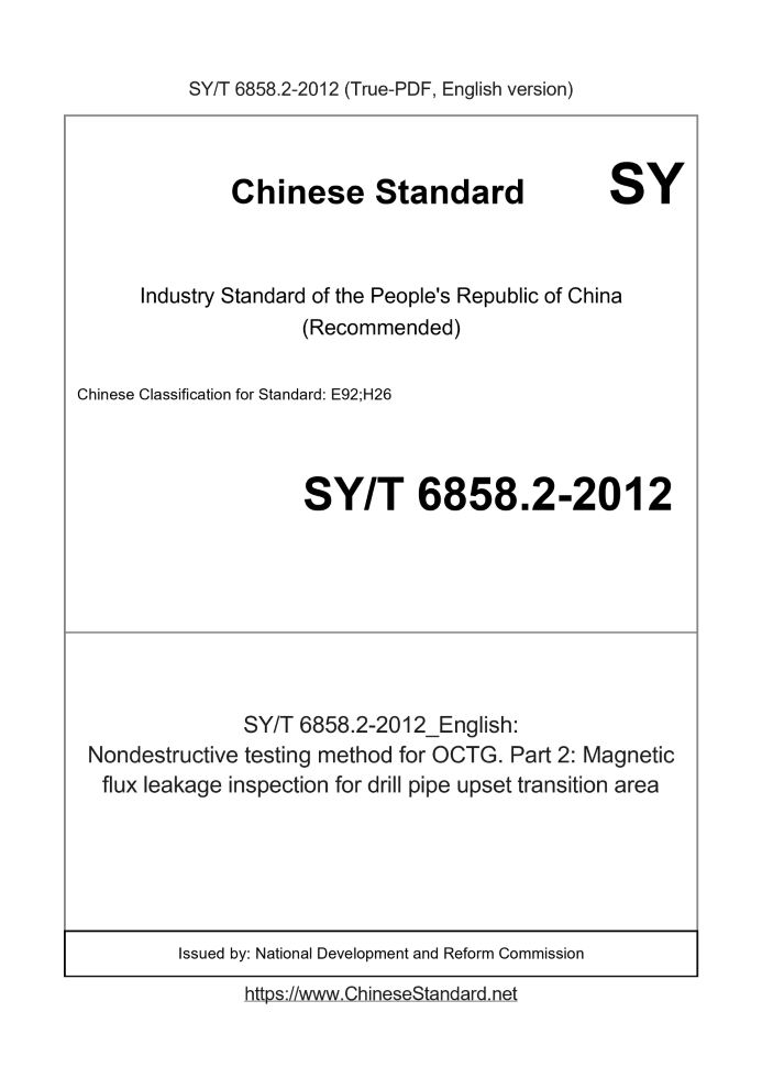 Delivery: <= 3 days. True-PDF full-copy in English will be manually translated and delivered via email. SY/T 6858.2-2012: Nondestructive testing method for OCTG. Part 2: Magnetic flux leakage inspection for drill pipe upset transition area Status: Valid