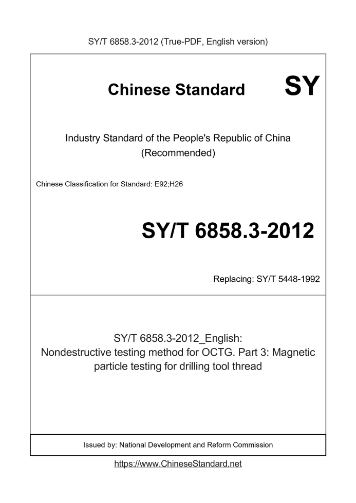 Delivery: <= 3 days. True-PDF full-copy in English will be manually translated and delivered via email. SY/T 6858.3-2012: Nondestructive testing method for OCTG. Part 3: Magnetic particle testing for drilling tool thread Status: Valid