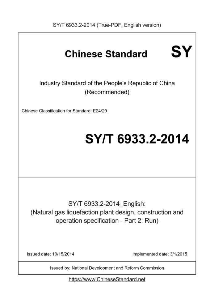 Delivery: <= 3 days. True-PDF full-copy in English will be manually translated and delivered via email. SY/T 6933.2-2014: (Natural gas liquefaction plant design, construction and operation specification - Part 2: Run) Status: Valid