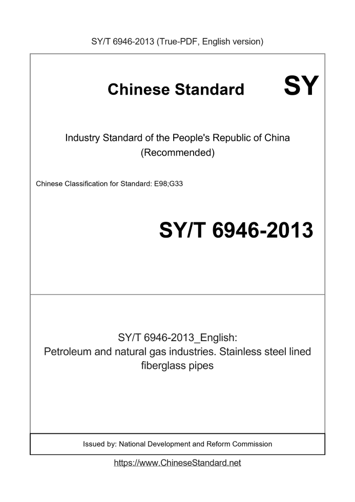Delivery: <= 3 days. True-PDF full-copy in English will be manually translated and delivered via email. SY/T 6946-2013: Petroleum and natural gas industries. Stainless steel lined fiberglass pipes Status: Valid