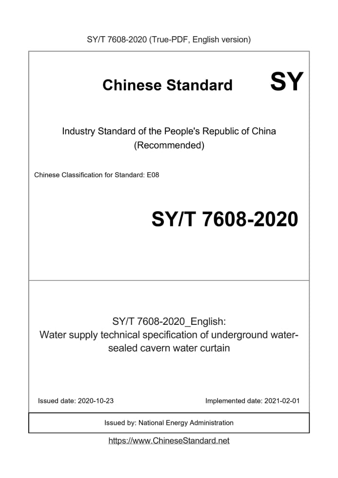 Delivery: <= 7 days. True-PDF full-copy in English will be manually translated and delivered via email. SY/T 7608-2020: Water supply technical specification of underground water-sealed cavern water curtain Status: Valid