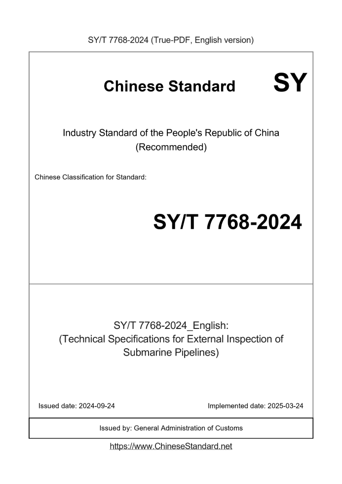 Delivery: <= 4 days. True-PDF full-copy in English will be manually translated and delivered via email. SY/T 7768-2024: (Technical Specifications for External Inspection of Submarine Pipelines) Status: Valid