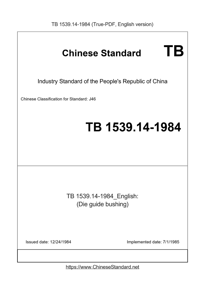 Delivery: <= 2 days. True-PDF full-copy in English will be manually translated and delivered via email. TB 1539.14-1984: (Die guide bushing) Status: Obsolete
